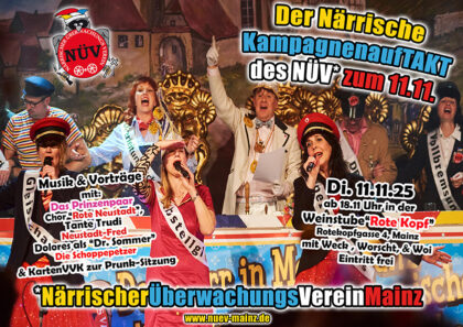 Fastnachtlicher KampagnenaufTAKT des Närrischen Überwachungsvereins Mainz e.V., am Di. 11.11.2025 ab 18:11 Uhr in der Weinstube „Rote Kopf“ Rotekopfgasse 4, 55116 Mainz -Eintritt frei- Der NÜV startet mit einem stimmungsvoll närrischen Knall in die fünfte Jahreszeit. Das ist Kneipenfastnacht pur: im Rausch der Schorlen … Read More